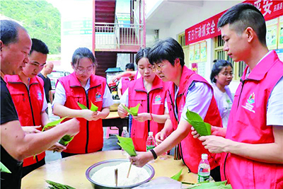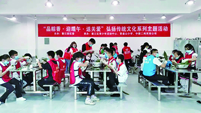 为弘扬传统文化,关心关爱留守儿童、困境儿童,在端午节来临之际,綦江团区委组织开展“品粽香·迎端午·送关爱”弘扬传统文化系列主题活动。活动由区青少年活动中心、营盘山小学、中建二局西南公司联合承办,15名青年志愿者和50余名留守儿童、困境儿童一起包粽子、品粽香、忆传统、扬文化。