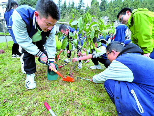 在植树环节中,同学们挖坑松土、搬树苗、填土、浇水……不一会儿,一棵棵树苗便种好了。不少同学还用马克笔写下了自己的美好愿望,挂在种好的树苗上。“愿我们都能成为想成为的人。”他们用寄语的方式为自己的人生“种下”了春天的希望。