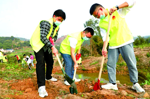 活动中,各行各业的青年志愿者、创新创业青年和新兴青年们每4人一组,情绪高昂、干劲十足、默契配合,搬树苗、种树苗、培土、浇水、挂牌……经过两个小时的辛勤劳动,山坡披上了由青翠苗木点缀的春装,在和煦的阳光下展现出蓬勃生机。