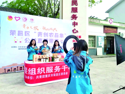 区青联副主席盛玉霞、通安村党总支书记邓跃虎、区青联委员冉彦玲、西部计划志愿者邓伯敏化身“网络主播”,大力宣传推介荣昌区特色农产品。