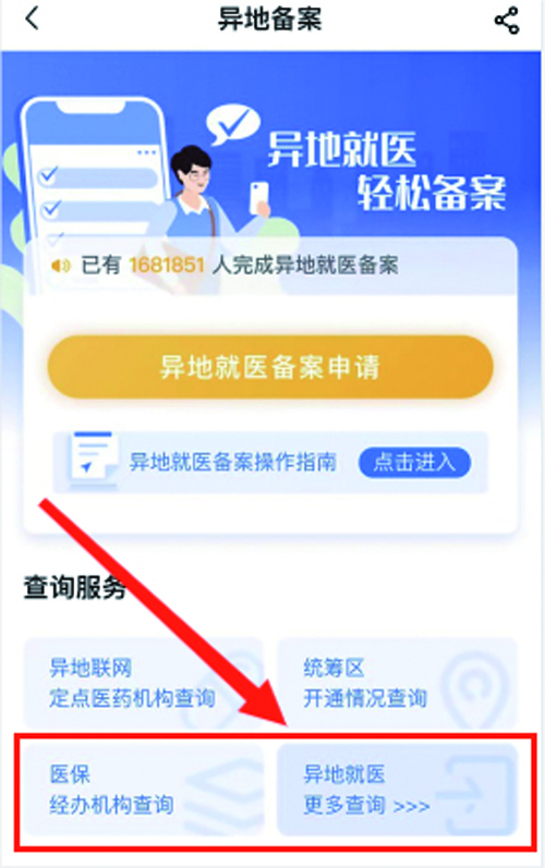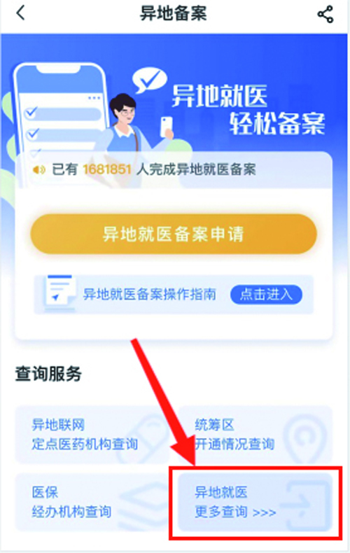 在国家医保服务平台App“异地备案”页面下方,找到并点击“异地就医更多查询”,可查询异地就医费用。