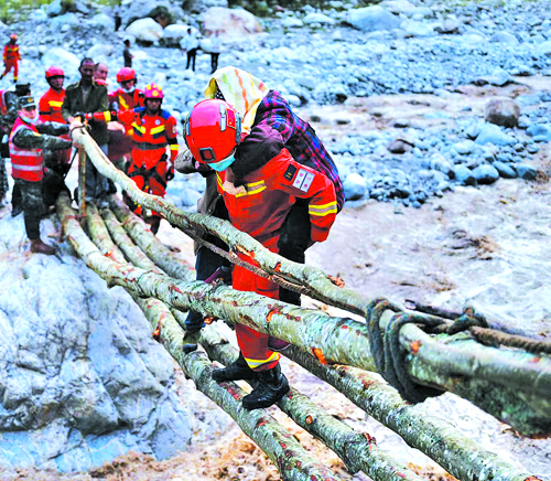 特警队员和消防救援人员,用身体和绳索搭起“生命桥”,打通救援通道。
