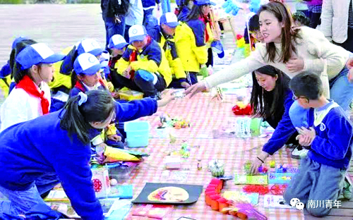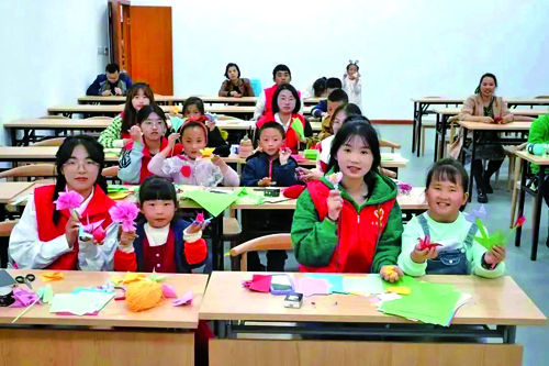 重庆移通学院青年社团走进綦江区新兴社区开展益智手工课堂主题活动。