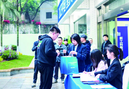 中国(重庆)国际智能建造产业创新大会,“涪小青”青年志愿者在会场签到处分发资料。