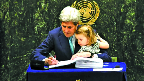 2016年4月22日,时任国务卿的克里代表美国签署全球应对气候变化的《巴黎协定》。当时,克里一手抱着孙女,一手签字,签完字还亲吻了孙女。