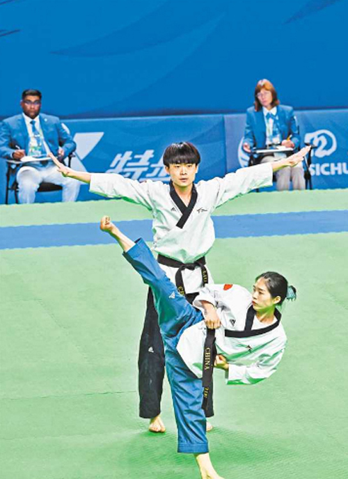 “中国队,雄起!”“中国队,加油!”“中国必胜!”赛场上,在观众震耳欲聋的助威声中,两人一套行云流水的动作令人叹为观止,在传统品势和自创品势的准确度、技术性、表现力上都得到最高分。最终,他们力克强敌韩国队,以7.240的总分获得混合双人品势金牌。