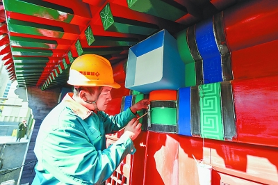 北京古建修缮现场,工人正在做油饰。(资料图)记者 邓伟摄