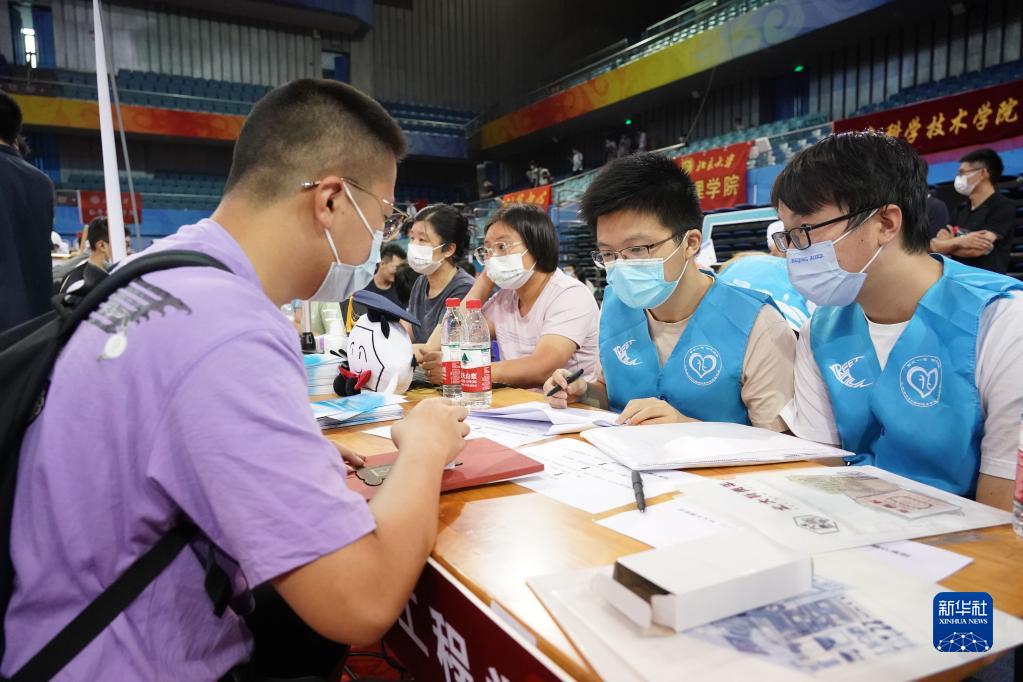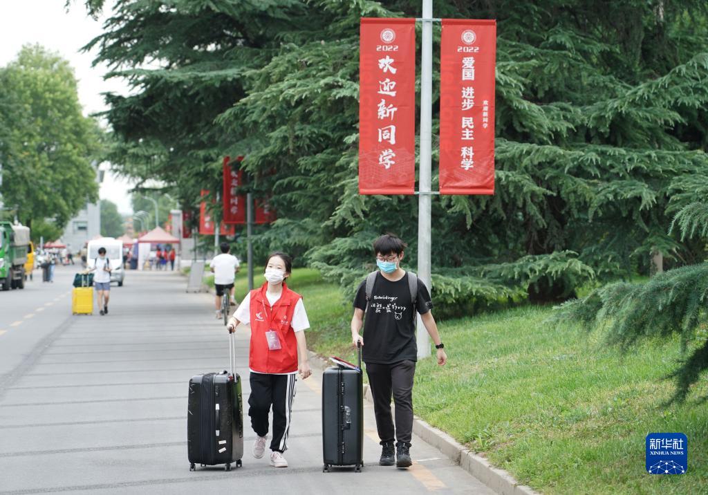 8月28日,在北京大学邱德拔体育馆,一名北京大学化学与分子工程学院2022级本科新生(左一)在报到。新华社记者 任超 摄
