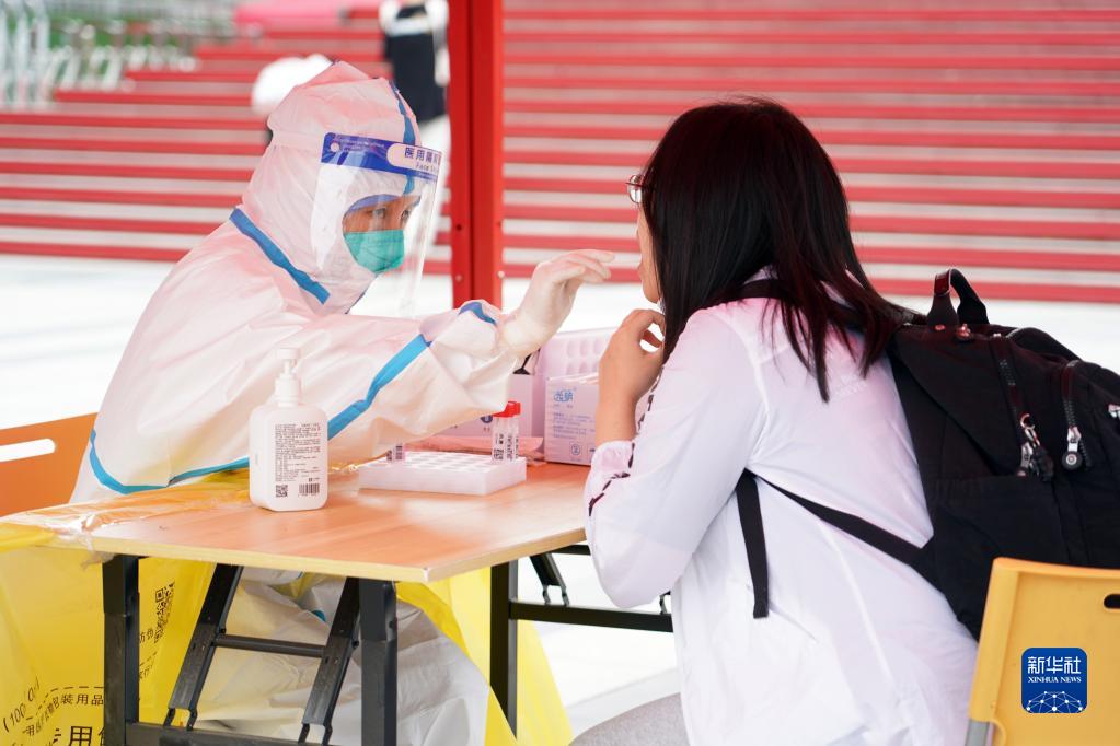 8月28日,医护人员为北京大学2022级本科新生进行核酸采样。新华社记者 任超 摄