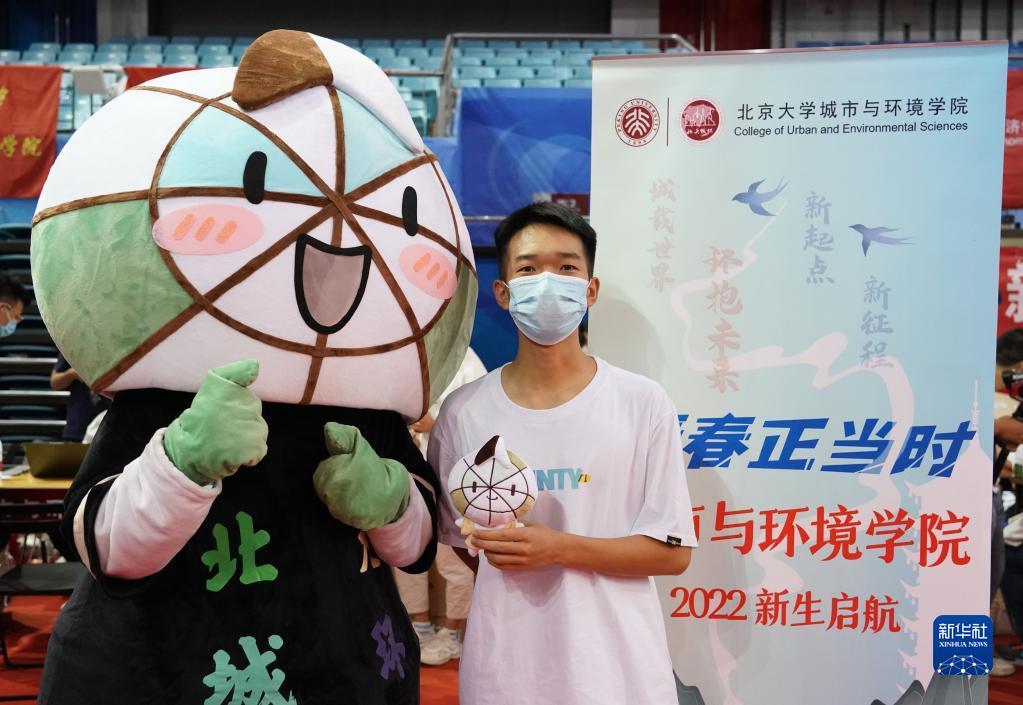 8月28日,在北京大学邱德拔体育馆,一名北京大学城市与环境学院2022级本科新生拍照留念。新华社记者 任超 摄