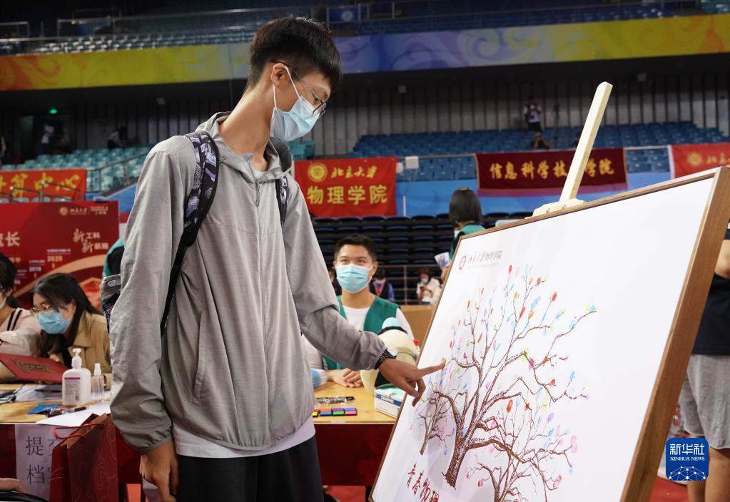 8月28日,在北京大学邱德拔体育馆,一名北京大学物理学院2022级本科新生在学院入学“签到树”上按彩色手印。新华社记者 任超 摄