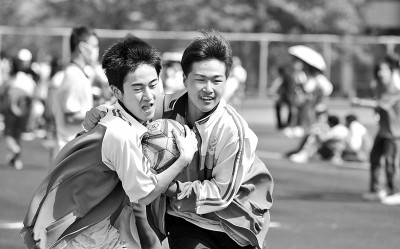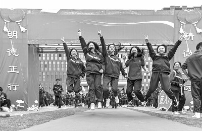 4月16日,安徽省安庆市田家炳中学高三学生在操场上游戏释放压力。江胜摄/光明图片