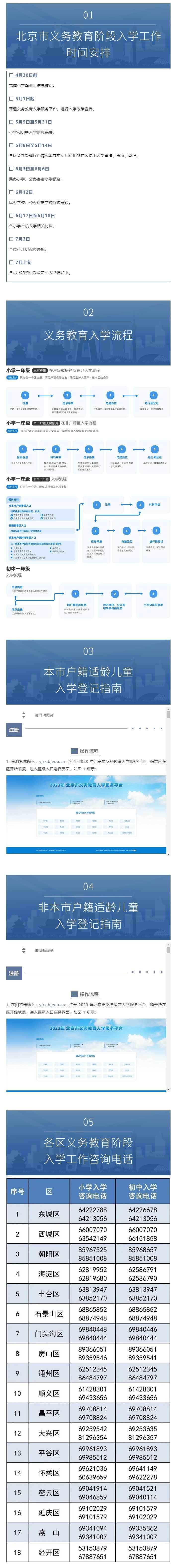 5月1日,北京市义务教育入学服务平台(yjrx.bjedu.cn)开通,家长可在该平台上查询市区入学文件、政策问答、学校信息、技术服务电话和各区政策咨询电话等信息。涉及适龄儿童少年入学方式、学校服务范围、入学结果等具体问题可向各区教委咨询。