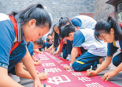 江西省南昌市梅汝璈故居里,参加“开学第一课”的学生在“赓续红色基因、凝聚复兴力量”横幅上签名。  |