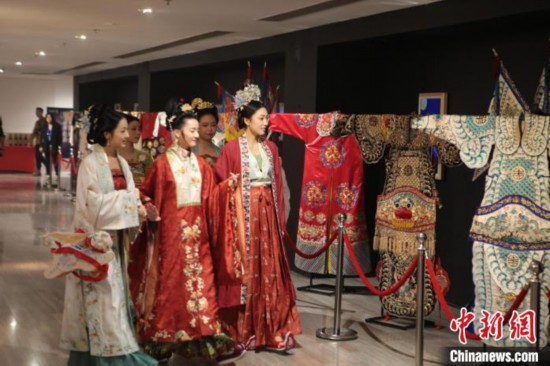 9月28日晚,第十四届中华世纪坛中秋诗会在京举行,图为民众身着汉服参观京剧服装。 主办方供图