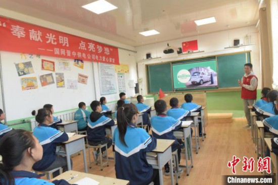 在国家电网“电力爱心教室”内,电力人员为乡村儿童科普电力知识。展望摄