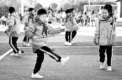 河北省唐山市路北区橡树湾小学学生利用课间时间做“跳袋鼠”游戏。新华社发