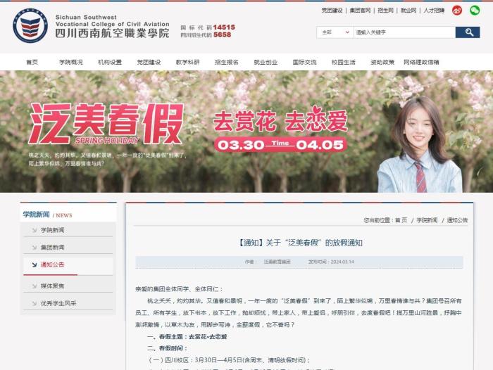 学校春假放假通知。四川西南航空职业学院供图